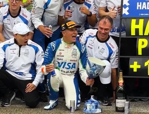 A 20 éves Isack Hadjar korábban nem jutott be az első háromba. A nagy eredmény miatt elszabadult az ünneplés, ami a trófeájába került.