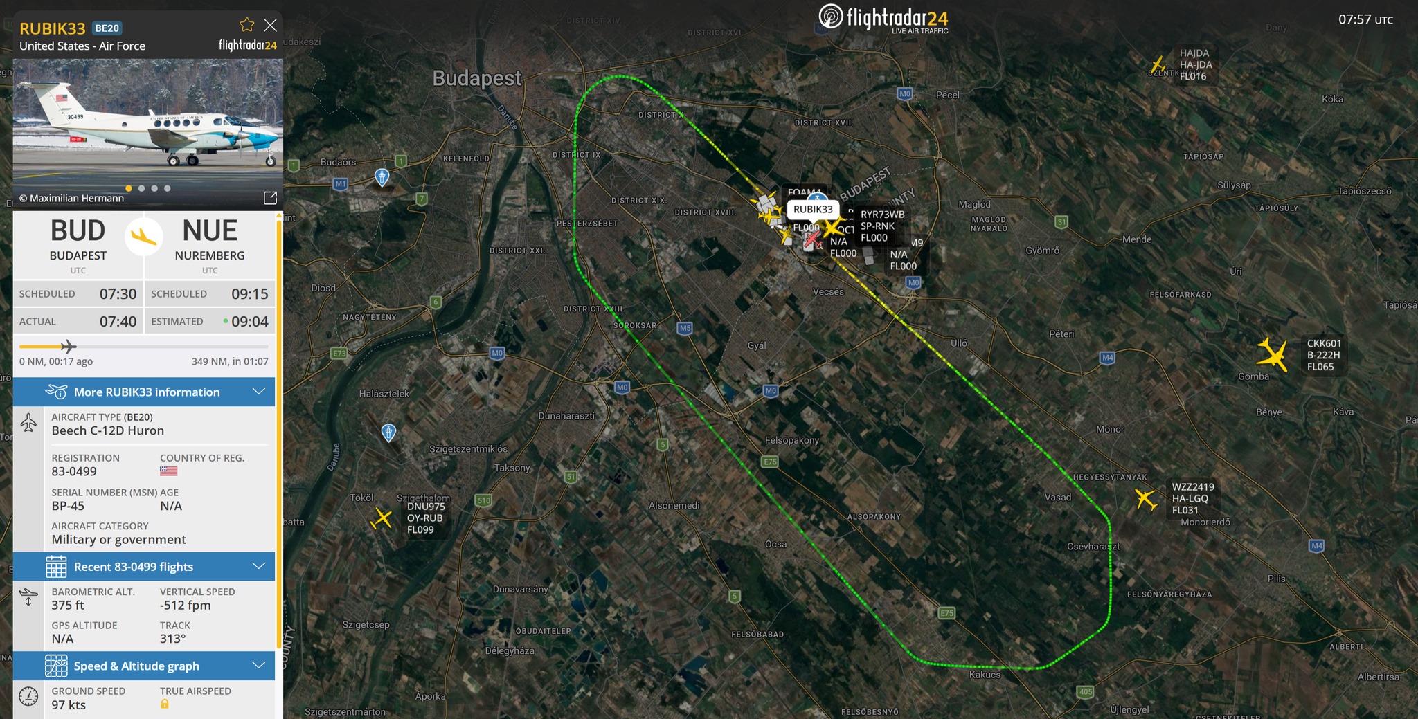 Egy Beech C-12D Huron típusú repülőgép kényszerült visszafordulni a Liszt Ferenc-repülőtérre műszaki probléma miatt. A Nürnbergbe tartó járat biztonságosan landolt, majd tűzoltók kísérték az állóhelyére.